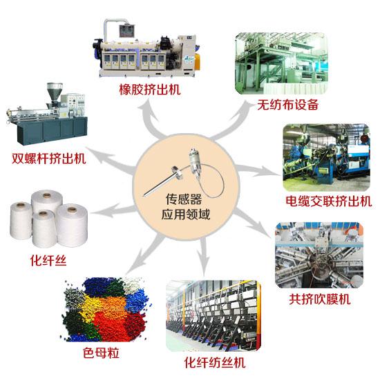 橡膠擠出機,塑料擠出機,塑膠押出機,電纜押出機,紡絲機,注塑機,熔體泵,無紡布設備等機械行業,產品大量配套于無紡布,色母粒,化纖紡絲,橡膠,塑膠等諸多產品行業中,水處理,食品機械行業市場。為我公司環保型高溫熔體壓力傳感器,高溫熔體壓力變送器主導對象。