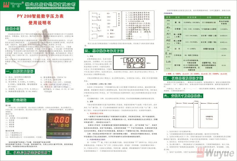 歡迎您選用湖北五岳傳感器有限公司生產的PY208/PY808智能數字壓力儀表。該說明書詳細的介紹了PY208/PY808的性能特點,參數指標,使用方法,維護保養等內容。使用前仔細閱讀本說明書,以便您正確使用。