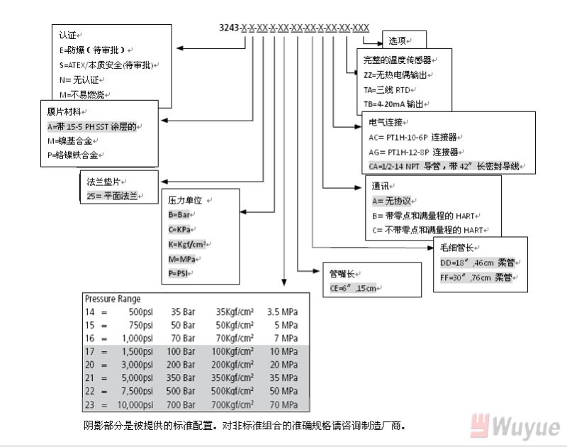 輸出,模擬:4-20mA(標準壓力,溫度可選) 輸出,數字:HART 綜合精度(錯誤)(20-100%滿量程): ±0.25%滿量程(3M和3M以上) +0.35%滿量程(1.5M和1.5以下) 溫度漂移(77-572℉,25-300℃):0.001%滿量程/℉,最大(0.001%滿量程/℃,最大) 重復性:±0.1%滿量程 爆破額定壓力:2X滿量程 超壓額定:1.5X滿量程 量程:1,500至10,000psi 可調范圍:6:1調節比,向下 負載電阻:250歐姆@18Vdc;500歐姆@23Vdc |
