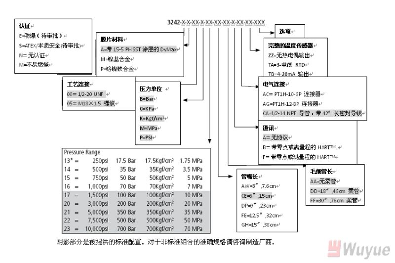 輸出,模擬:4-20mA(標準壓力,溫度可選) 輸出,數字:HART 綜合精度(錯誤)(20-100%滿量程): ±0.25%滿量程(3M和3M以上) ±0.35%滿量程(1.5M和1.5以下) 溫度漂移(77-572℉,25-300℃): 0.001%滿量程/℉,最大(0.001%滿量程/℃,最大) 重復性:±0.1%滿量程 爆破額定壓力:2X滿量程 超壓 額定:1.5X滿量程 量程:1,500至10,000psi 可調范圍:6:1調節比,向下 負載電阻:250歐姆@18Vdc;500歐姆@23Vdc |